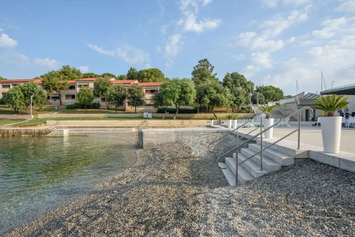 Zum langen Felsstrand mit betonierten Liegeflächen und einer kleinen Kiesbucht sind es etwa 100 m. Sonnenschirme und Liegestühle gegen Gebühr. Duschen, Umkleidekabinen, Sonnenterrasse mit Zugang zum Meer, Sandkasten und Wasserpark.